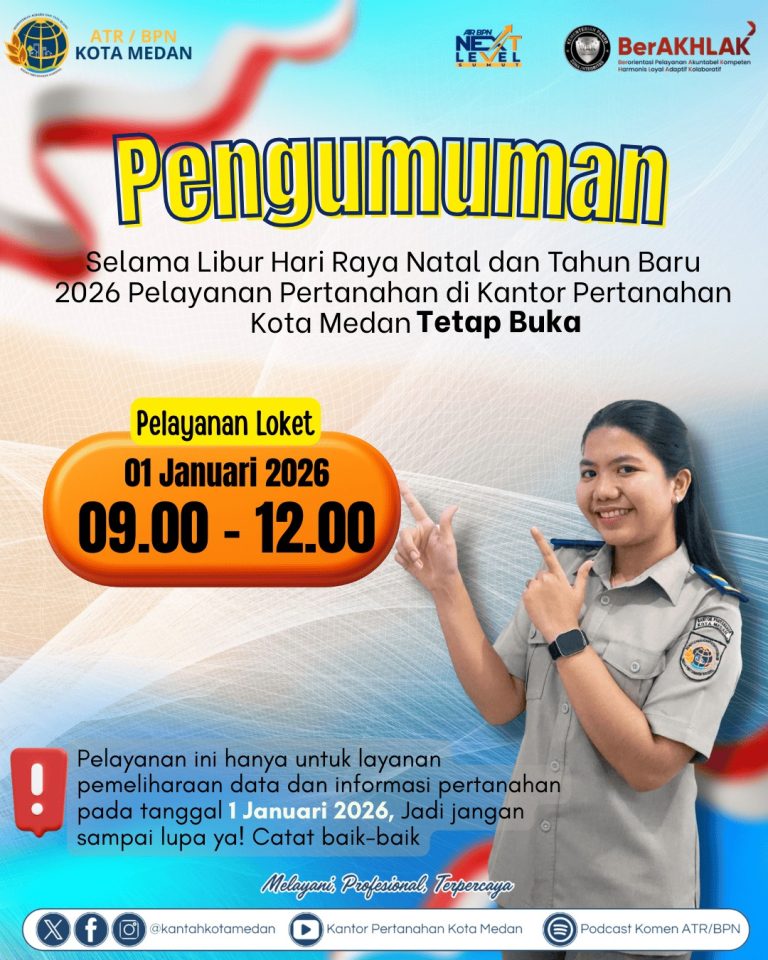 Medan, BLINKISS – Kantor Pertanahan Kota Medan tetap membuka pelayanan kepada masyarakat pada Kamis, 1 Januari 2026, meskipun bertepatan dengan...