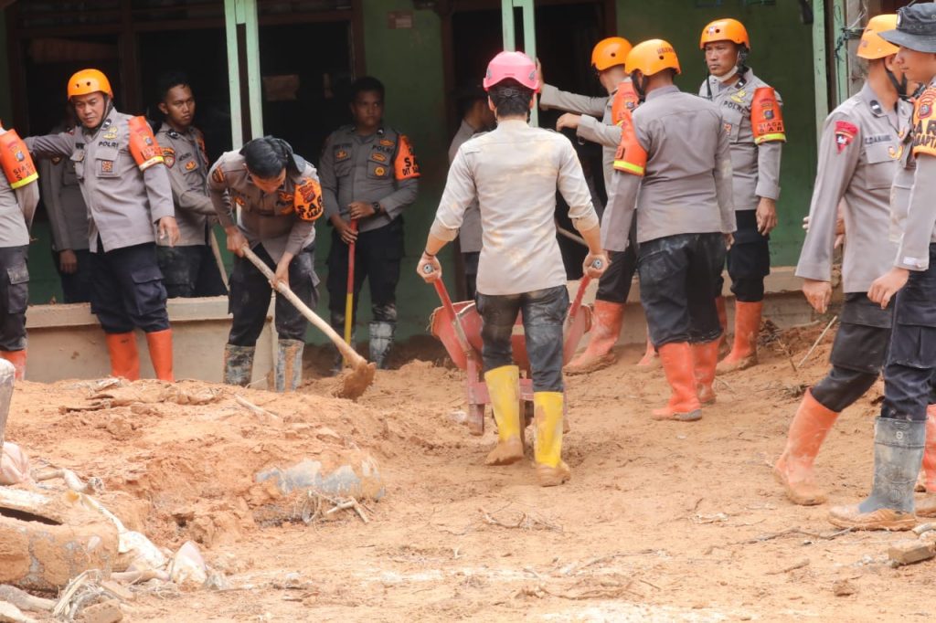 Tidak hanya fokus pada pembukaan jalan, personel di lapangan juga membantu warga yang rumahnya dipenuhi material longsor. Warga dan petugas tampak bergotong-royong membersihkan lumpur agar rumah kembali layak dihuni dan aman dari ancaman susulan.