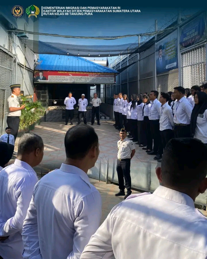 Rumah Tahanan Negara Kelas IIB Tanjung Pura Kantor Wilayah Direktorat Jenderal Pemasyarakatan Sumatera Utara melaksanakan apel pagi bersama pegawai di Lapangan Apel Rutan Tanjung Pura yang dipimpin langsung oleh Karutan Tanjung Pura, Fransisco Pandia. Senin (05/01)