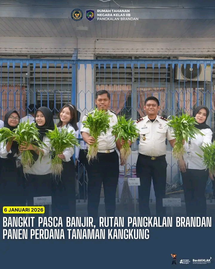 Rumah Tahanan Negara Kelas IIB Pangkalan Brandan melaksanakan panen perdana tanaman kangkung pascabanjir, Selasa, 6 Januari 2026. Kegiatan ini diikuti langsung oleh Karutan, Ka.KPR, Warga Binaan Pemasyarakatan, serta peserta magang.