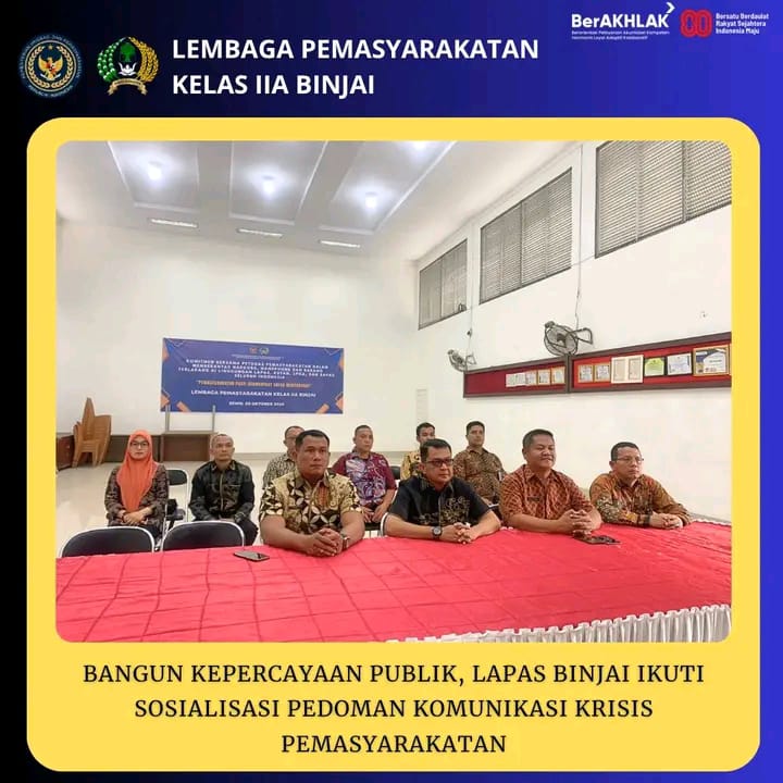 Dalam upaya memperkuat kepercayaan publik terhadap lembaga pemasyarakatan dan meningkatkan keterbukaan informasi kepada masyarakat, Lembaga Pemasyarakatan (Lapas) Kelas IIA Binjai mengikuti kegiatan Sosialisasi Pedoman Manajemen Komunikasi Krisis Pemasyarakatan Terintegrasi yang digelar secara daring oleh Direktorat Jenderal Pemasyarakatan Yang di Ikuti Kalapas Binjai berserta Pejabat Struktural pada Kamis (31/10/2025).