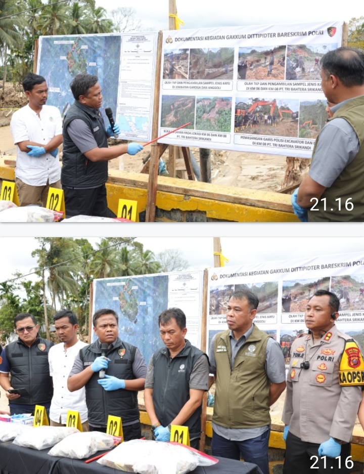 Saat memimpin proses pemeriksaan di lokasi, Dirtipiter Bareskrim Polri, Brigjen Pol. Moh. Irhamni, S.I.K., M.H., menjelaskan bahwa kayu-kayu yang tersangkut di dua jembatan utama telah menutup aliran sungai sehingga menimbulkan luapan air besar yang menghantam pemukiman warga.