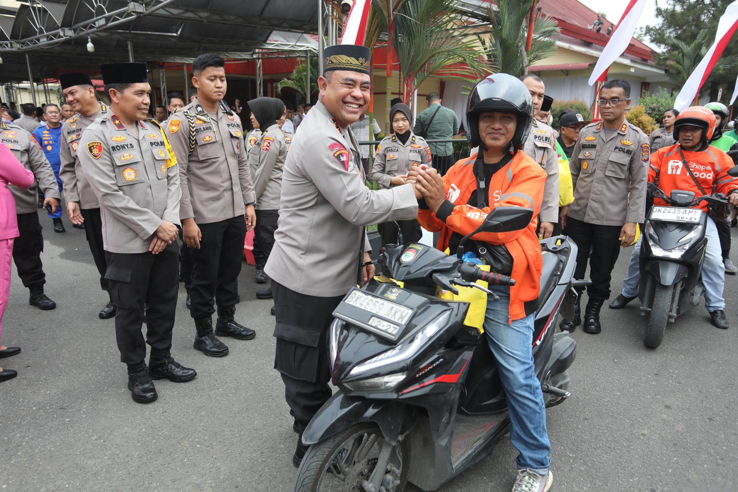 Ratusan paket bantuan dibagikan kepada masyarakat yang hadir, termasuk kepada komunitas pengemudi ojek online (ojol) di Sumatera Utara. Perwakilan dari keluarga besar ojol Sumut mengucapkan terima kasih kepada Kapolda Sumut beserta seluruh jajaran Polda Sumut atas perhatian dan kepeduliannya.