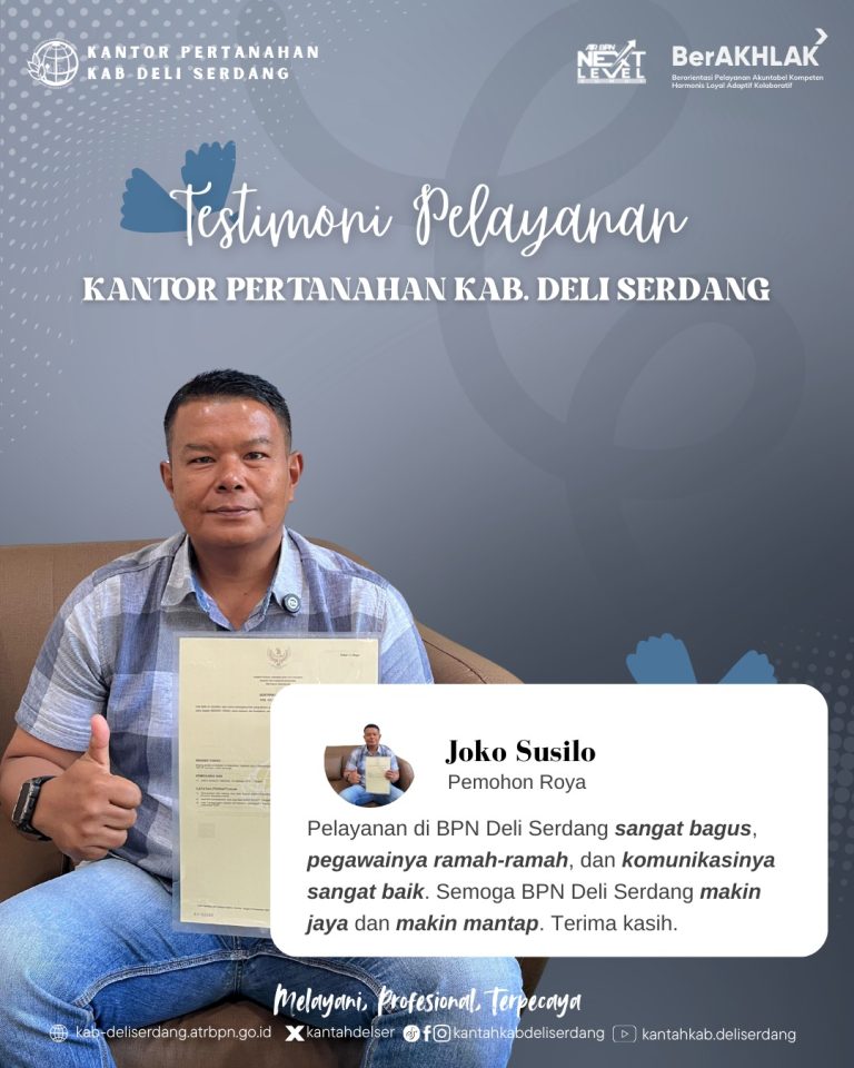 Deli Serdang, BLINKISS - Kepuasan masyarakat kembali tercermin di Kantor Pertanahan Kabupaten Deli Serdang. Bapak Joko Susilo, warga Desa Hamparan...