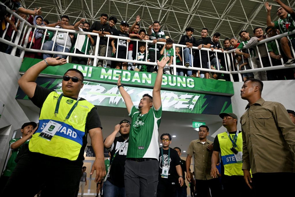 Gubernur Sumatera Utara, Muhammad Bobby Afif Nasution, turun ke lapangan meredam emosi penonton usai kekalahan PSMS Medan dari Garudayaksa pada pekan kedelapan Pegadaian Championship 2025/2026 di Stadion Utama Sumatera Utara, Jumat (31/10/2025) malam. PSMS takluk 0-2 lewat penalti pada menit ke-20 dan 75. Diskominfo Sumut / Fahmi Aulia