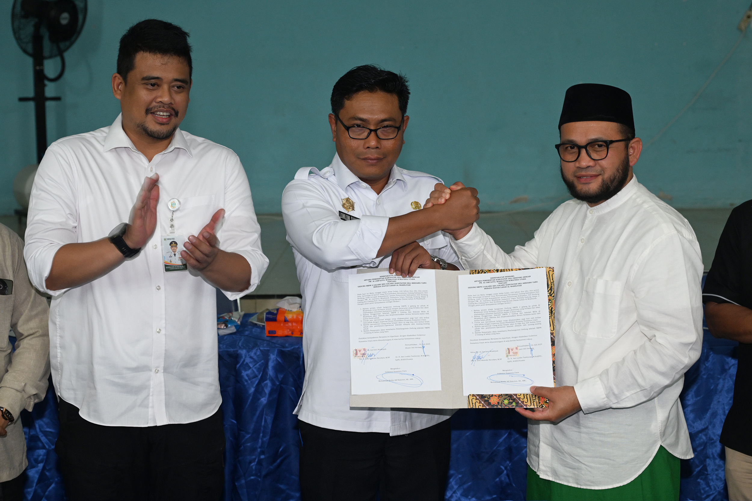 ”Jadi bukan lagi pinjam pakai, kita patuhi Permendagri tersebut. Dan proses hibah kita minta tetap dijalankan. Soal pembangunan gedung baru SMPN 2 Galang, nanti kita upayakan untuk bantuan pembangunannya. Menunggu itu, kedua belah pihak, baik Pemkab Deliserdang maupun Al Jam’iyyatul Washliyah, bisa kembali menggunakan gedung sekolah yang sekarang secara bersama-sama, dibagi dua. Dan proses belajar upayakan bisa dimulai secepatnya, kalau bisa Senin (21/7/2025) depan,” jelas Bobby.