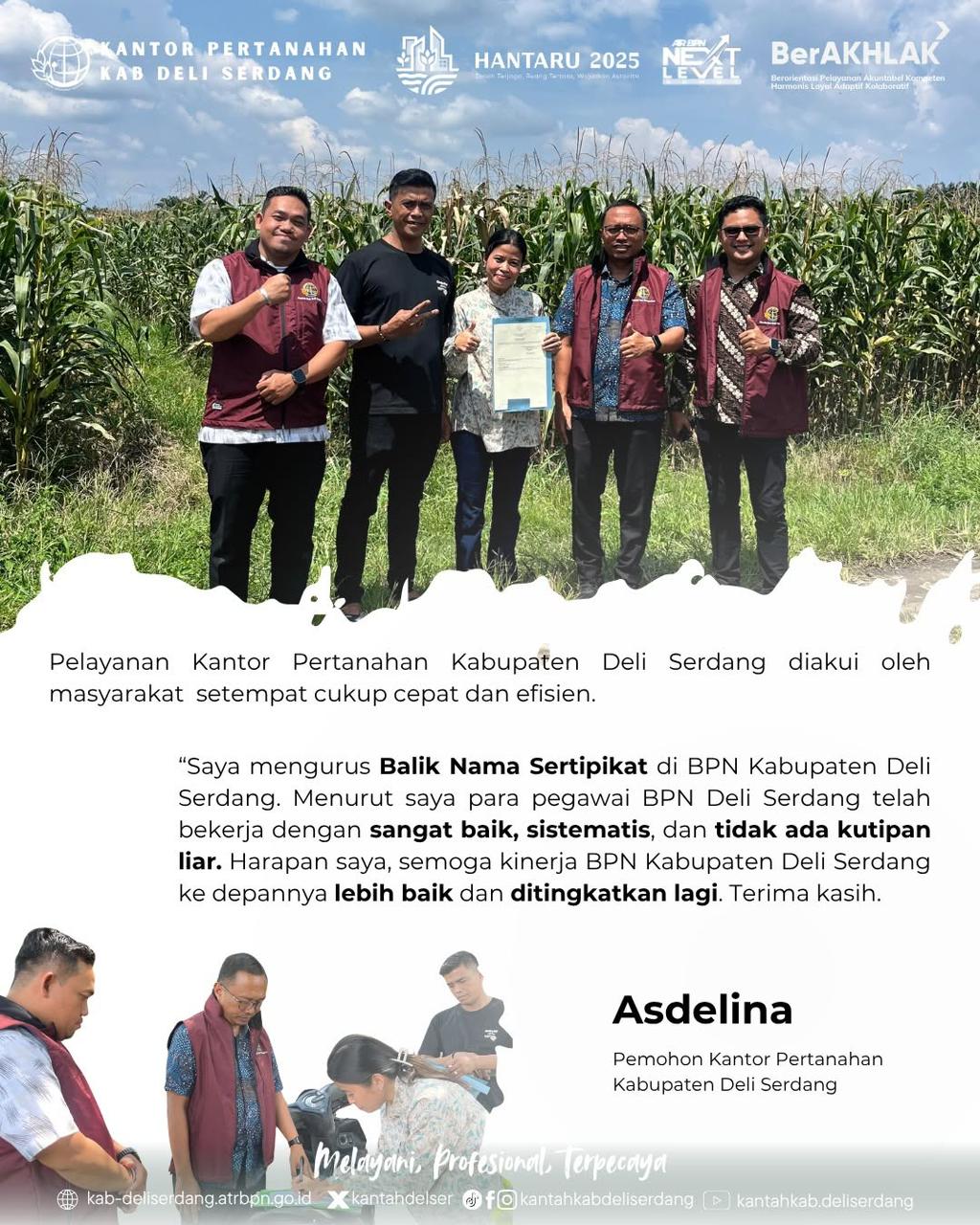 Ibu Asdelina mengaku sangat senang dan berterima kasih atas perhatian serta kemudahan layanan yang diberikan. “Saya bersyukur karena sertipikat balik nama saya sudah diterima tanpa pungutan biaya apa pun. Terima kasih kepada BPN Deli Serdang. Semoga ke depan kinerjanya semakin baik,” ujarnya.