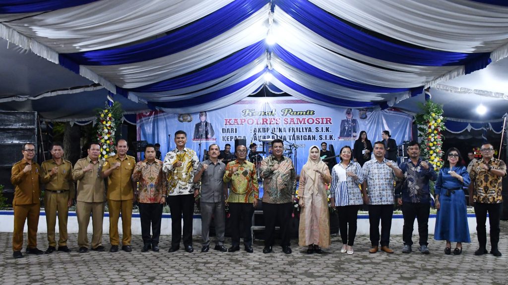 Bupati Vandiko T. Gultom bersama Wakil Bupati (Wabup) Ariston Tua Sidauruk menyambut kehadiran Kapolres Samosir yang baru, AKBP Rina Sry Nirwana Tarigan, S.I.K., sekaligus melepas Kapolres lama, AKBP Rina Frillya, S.I.K., yang mendapat amanah baru sebagai Kapolres Tebing Tinggi.