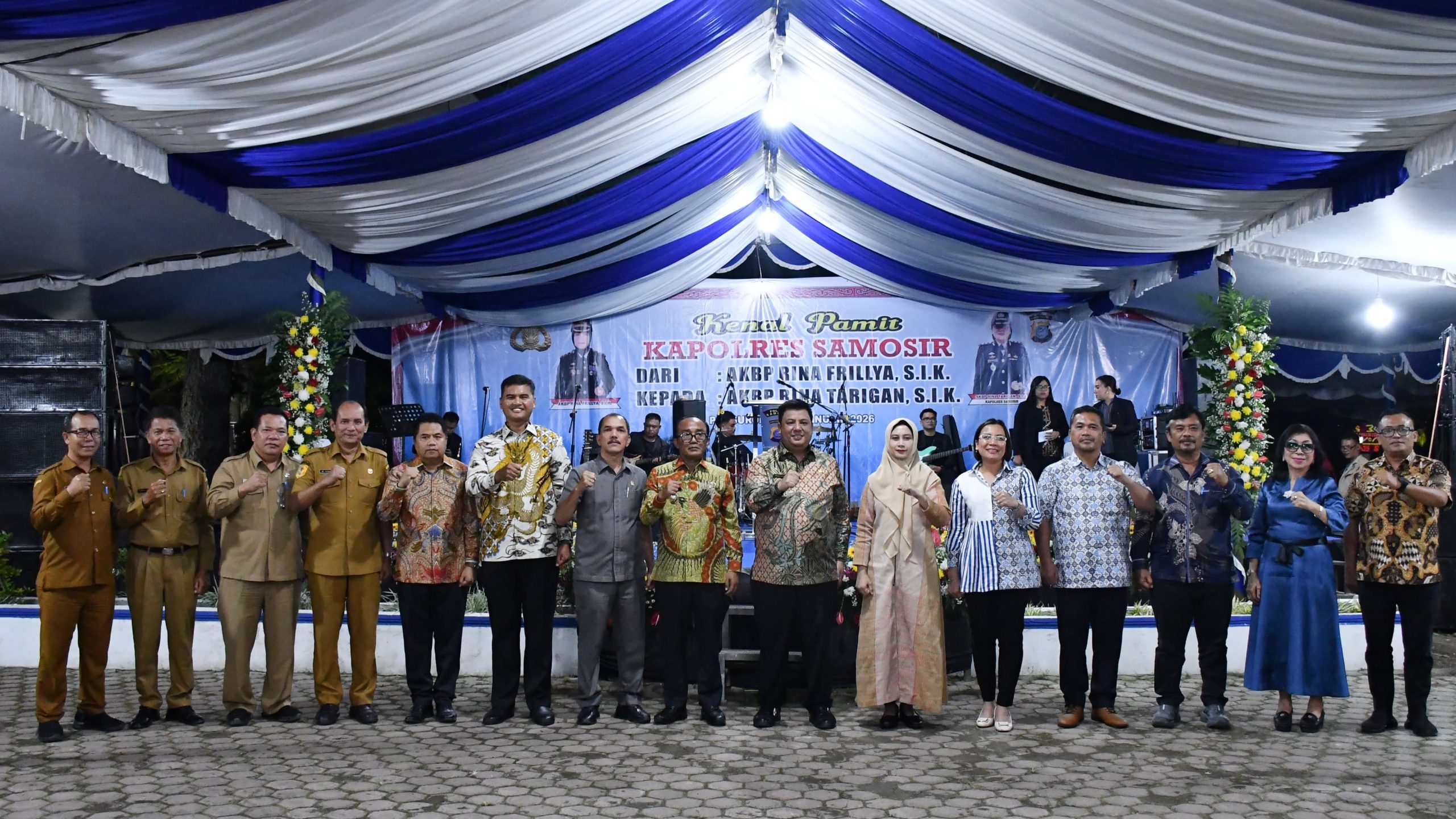 Acara pisah sambut jabatan Kapolres Samosir tersebut berlangsung di Rumah Dinas Bupati Samosir, yang dihadiri unsur Forum Koordinasi Pimpinan Daerah (Forkopimda), tokoh Agama, masyarakat, perwakilan organisasi kemasyarakatan.