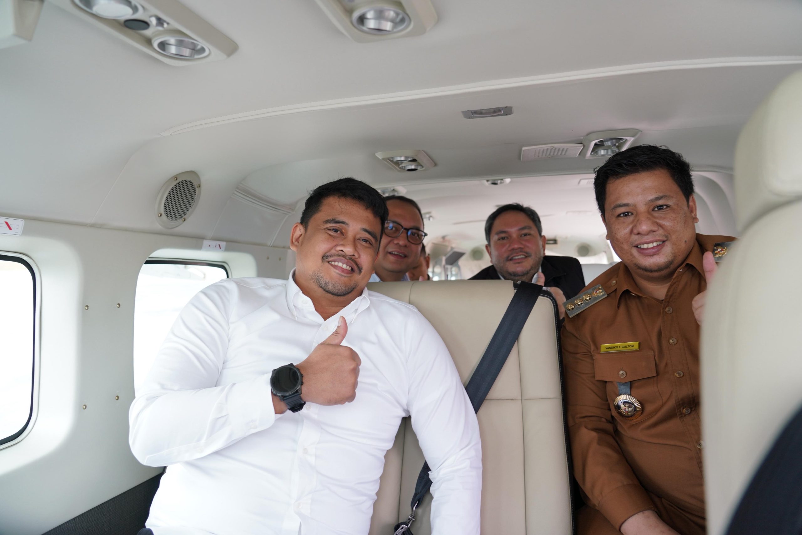 Gubernur Sumatera Utara (Gubsu) Muhamamd Bobby Afif Nasution bersama Bupati Samosir Vandiko T Gultom dan Bupati Pakpak Barat Frans Bernard Tumanggor mencoba ujicoba penerbangan perdana pesawat Amfibi dari Bandara Silangit, menuju Pelabuhan Mariana Resort Tuktuk Siadong, Kec. Simanindo.