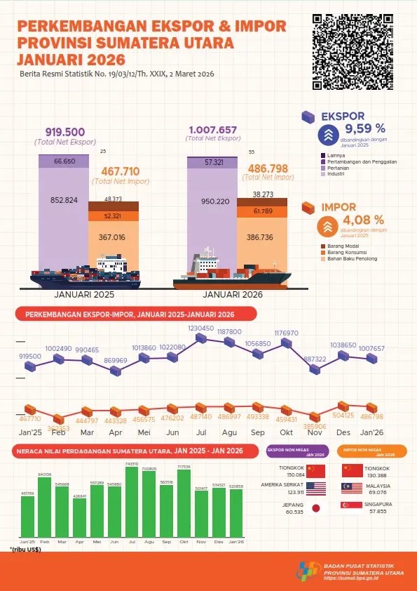 Selanjutnya, Ekspor dan Impor Provinsi Sumatera Utara pada Desember 2025 masing-masing 1.038,65 Juta USD dan 504,12 Juta USD. Ekspor dan Impor Provinsi Sumatera Utara pada September 2025 masing-masing 1.056,85 Juta USD dan 493,34 Juta USD