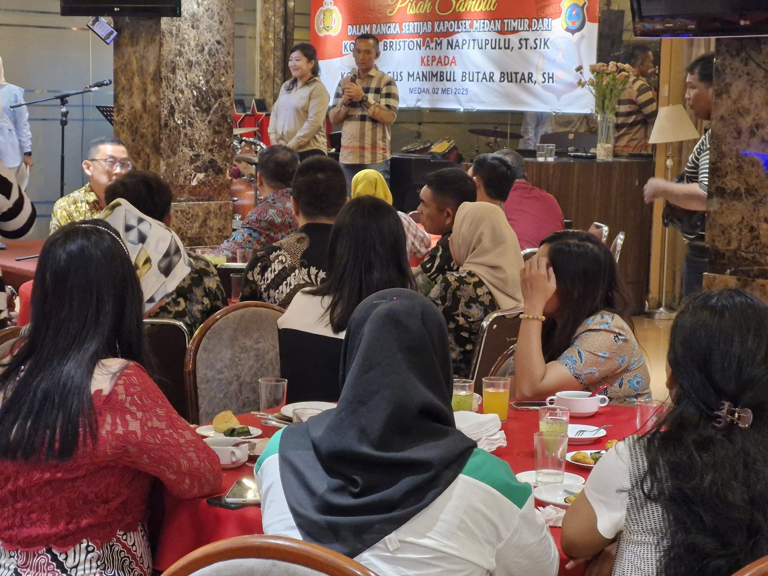 Camat Medan Timur Noor Alfi Fane, yang hadir bersama Camat Medan Perjuangan Hidayat dan Danramil Kapten Czi Soni P. Ginting, menyampaikan apresiasi atas pengabdian Kapolsek sebelumnya.