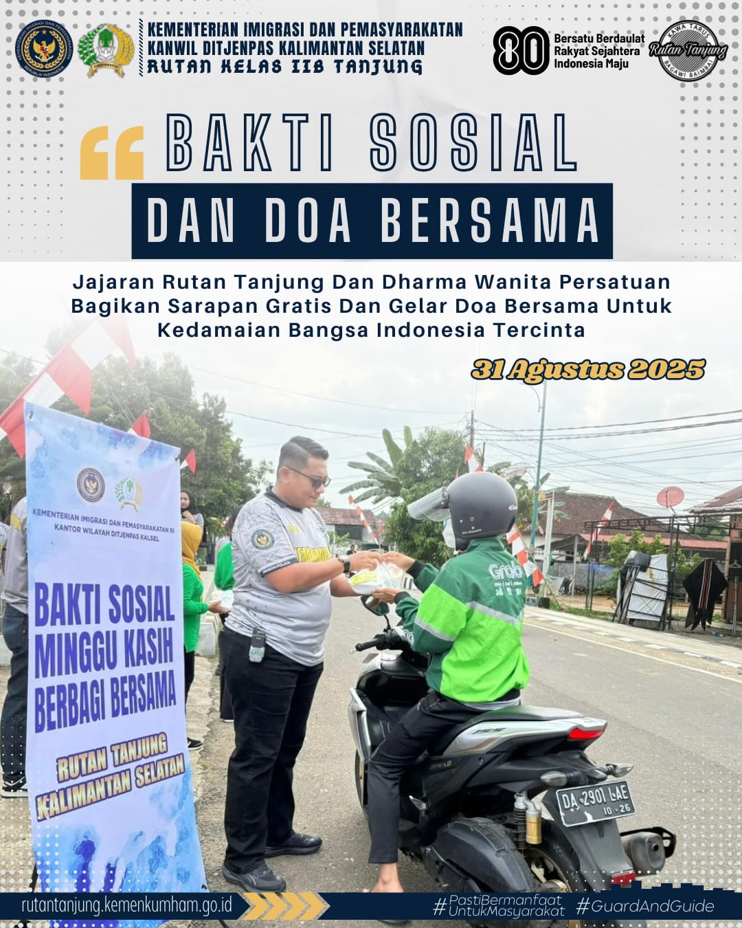 Rumah Tahanan Negara (Rutan) Kelas IIB Tanjung kembali menunjukkan komitmen untuk terus peduli terhadap sesama dengan mengadakan kegiatan Bakti Sosial Minggu Kasih Berbagi bersama dan Doa Bersama yang diadakan di Depan Rutan dan di Masjid Al-Mustaqim. Minggu (31/08/2025).