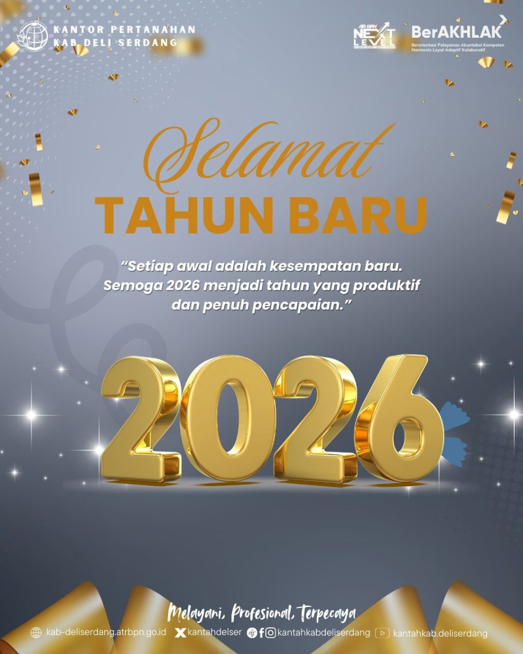 Deli Serdang,  BLINKISS – Menyambut pergantian tahun, segenap jajaran Kantor Pertanahan Kabupaten Deli Serdang menyampaikan ucapan Selamat Tahun Baru 2026 kepada seluruh masyarakat. Harapan akan terciptanya kinerja yang semakin baik, pelayanan yang semakin optimal, serta peningkatan produktivitas di tahun yang baru menjadi pesan utama dalam momentum ini.