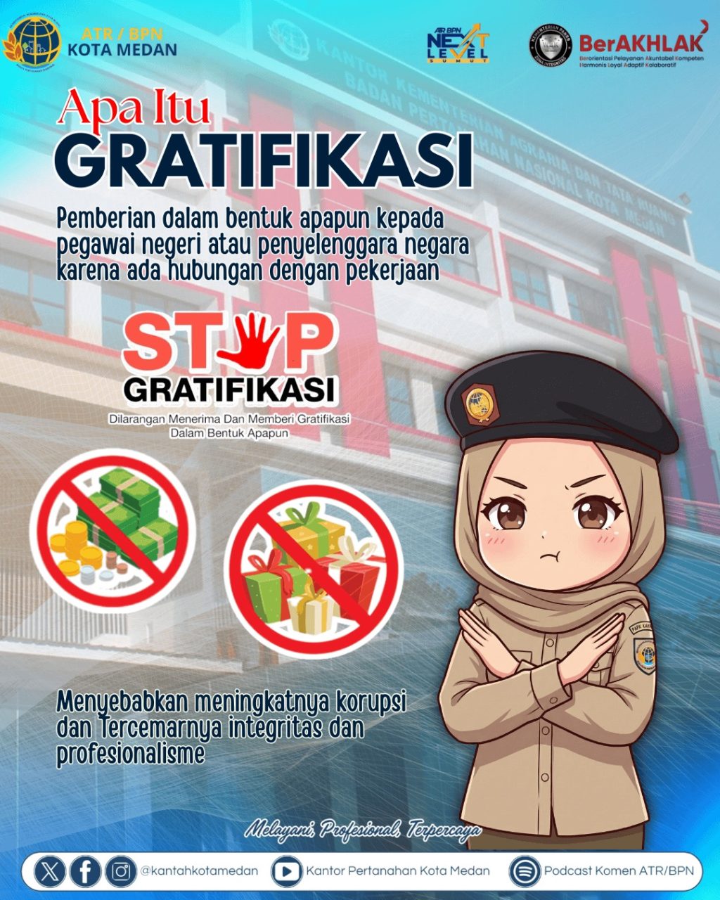 Melalui gerakan “Tolak Gratifikasi”, Kantor Pertanahan Kota Medan juga mengajak masyarakat untuk berperan aktif mendukung terciptanya pelayanan yang jujur dan akuntabel. Masyarakat diimbau agar tidak memberikan hadiah, uang, maupun bentuk gratifikasi lainnya kepada petugas, baik sebelum, selama, maupun setelah proses pelayanan berlangsung.