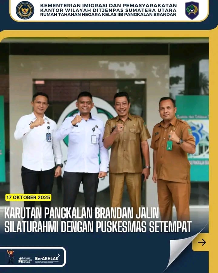 Kepala Rumah Tahanan Negara Kelas IIB Pangkalan Brandan, Akmalun Ikhsan, bersama jajaran melakukan kunjungan ke Puskesmas Pangkalan Brandan. Kunjungan ini disambut langsung oleh Kepala Puskesmas Pangkalan Brandan.