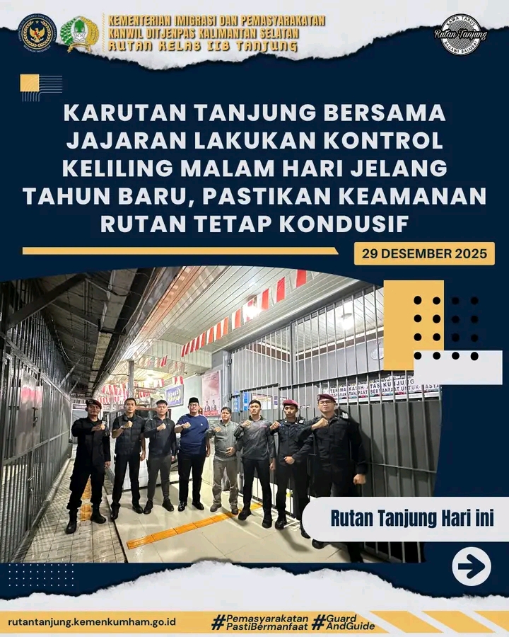 Dalam rangka menjaga stabilitas keamanan dan ketertiban Pada momen Libur tahun baru kepala Rumah Tahanan negara Rutan kelas llB Tanjung rayamon Andika Girsang, melaksanakan kegiatan kontrol keliling malam hari di seluruh area Rutan Tanjung kegiatan ini dilakukan sebagai langkah antisipasi untuk memastikan situasi Rutan tetap aman tertib dan kondusif selama berlangsungnya Libur tahun baru serta untuk memastikan kesiagaan Rutan Tanjung dalam menghadapi potensi banjir yang sudah melanda beberapa daerah di kabupaten Tabalong senin 29-12-2025