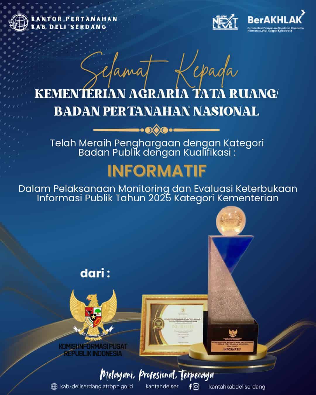 Kementerian ATR/BPN Raih Predikat “Informatif” 2025, Kantah Deli Serdang Sampaikan Apresiasi