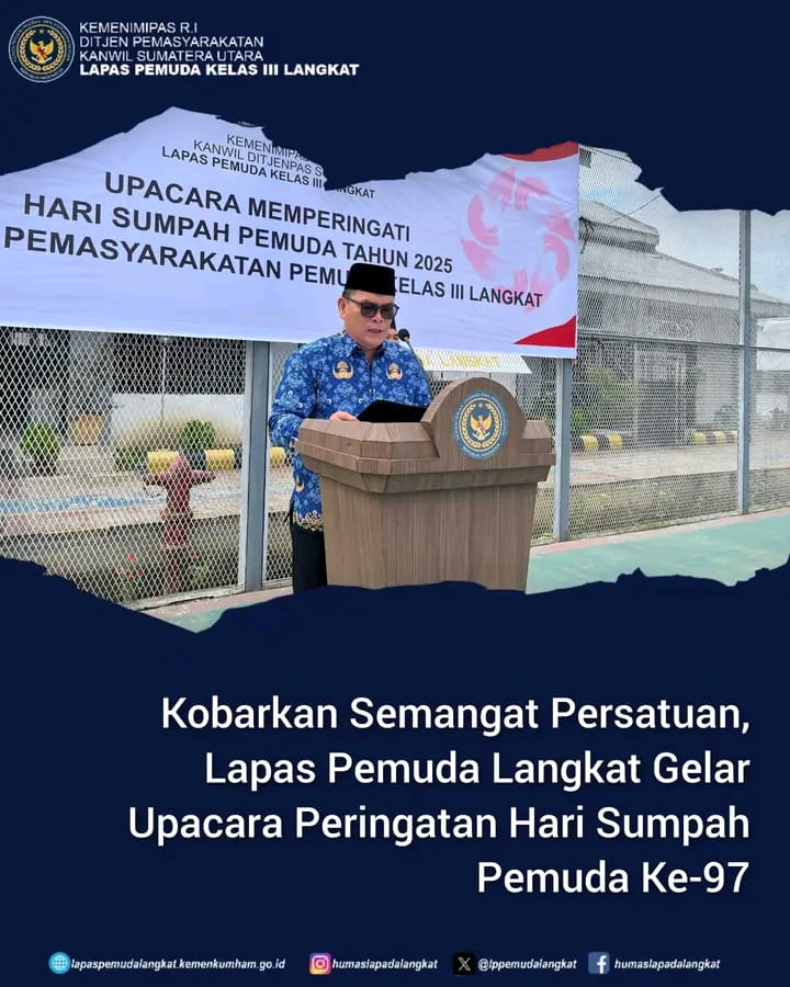 Kalapas Pemuda Langkat, Kenal Purba membacakan sambutan Menteri Pemuda dan Olahraga (Menpora) yang menekankan peran penting generasi muda dalam peringatan Hari Sumpah Pemuda untuk menjadi pengingat bagi seluruh insan pemasyarakatan untuk meneladani semangat para pemuda tahun 1928 yang berani menyatukan perbedaan demi satu tujuan, yaitu Indonesia yang bersatu.