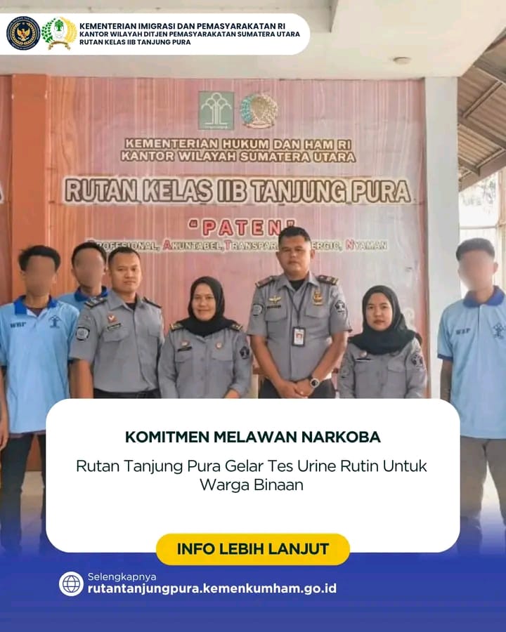 Rumah Tahanan Negara Kelas IIB Tanjung Pura melakukan tes urine untuk warga binaan secara rutin. Kegiatan ini sebagai bentuk komitmen Rutan Tanjung Pura dalam melawan narkoba serta melaksanakan araha 13 Program Akselerasi Kementerian Imigrasi dan Pemasyrakatan. Selasa (21/10)