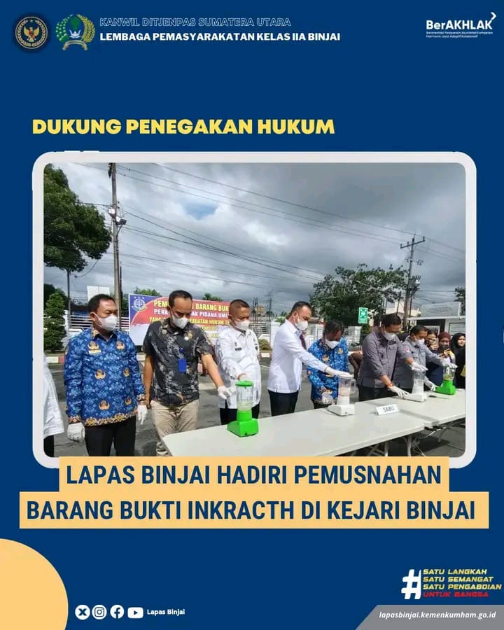 Kepala Lembaga Pemasyarakatan (Lapas) Kelas IIA Binjai, Wawan Irawan melalui Kasi Binadik, Andi Gultom menghadiri kegiatan pemusnahan barang bukti dari perkara tindak pidana umum yang telah berkekuatan hukum tetap (inkracht). Bertempat di Kantor Kejaksaan Negeri (Kejari) Binjai. Rabu (17/12/2025)