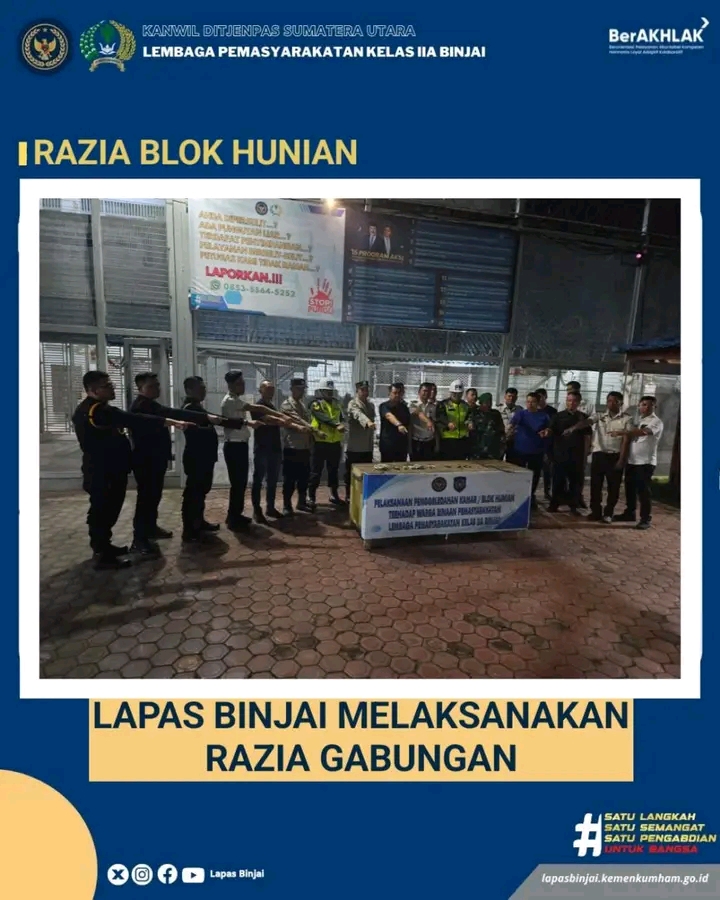 Kepala Lapas Kelas IIA Binjai Wawan Setiawan yang memimpin Apel Razia Gabungan menegaskan bahwa razia ini merupakan implementasi nyata dari arahan Direktur Jenderal Pemasyarakatan dalam rangka menciptakan lingkungan lapas yang aman, tertib, dan bebas dari Halinar.