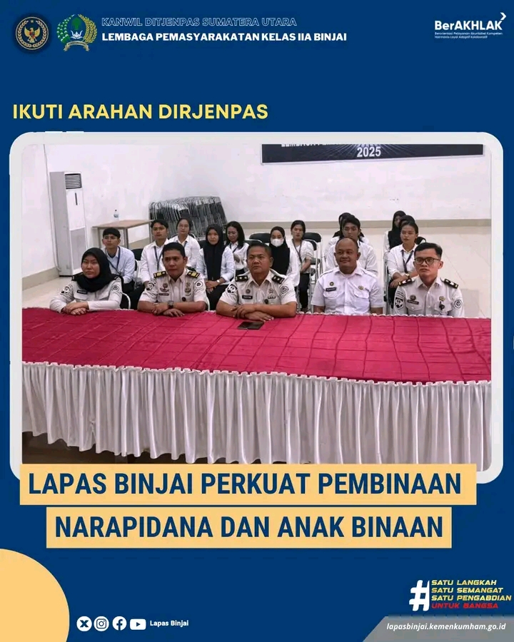 Kepala Lapas Kelas IIA Binjai menyampaikan bahwa arahan yang diberikan menjadi pengingat sekaligus motivasi bagi seluruh jajaran untuk terus meningkatkan kualitas pembinaan bagi warga binaan.