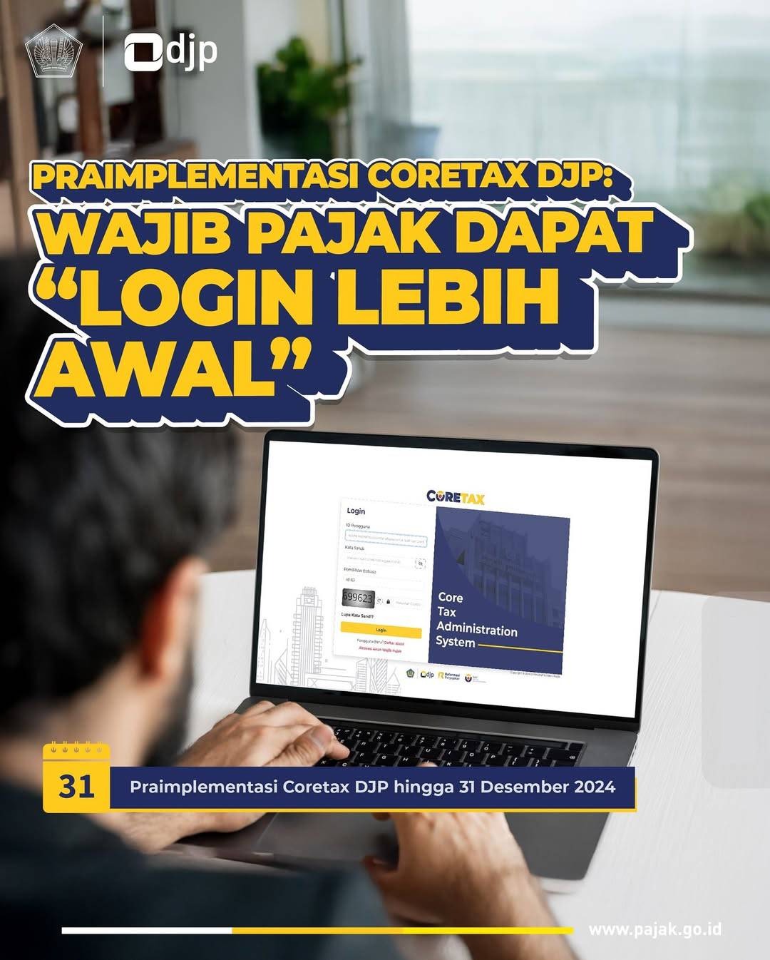 Hal ini untuk memberikan kemudahan pada saat implementasi, dalam masa praimplementasi ini, Wajib Pajak dapat melakukan log in ke sistem Coretax DJP mulai hari Selasa tanggal 24 Desember 2024. Coretax DJP dapat diakses oleh wajib pajak yang telah memiliki akun DJP Online pada tautan https://www.pajak.go.id/coretaxdjp/.