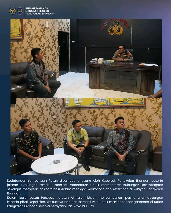 Menjelang perayaan Hari Raya Idul Fitri 1447 H/2026 M, Kepala Rumah Tahanan Negara Kelas IIB Pangkalan Brandan, Akmalun Ikhsan, bersama jajaran melakukan kunjungan silaturahmi ke Polsek Pangkalan Brandan pada Jumat (13/03/2026) guna memperkuat koordinasi pengamanan Rutan selama perayaan Lebaran.