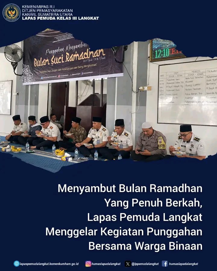 Lembaga Pemasyarakatan Pemuda Kelas III Langkat menggelar tradisi Punggahan dalam rangka menyambut bulan suci Ramadhan 1447 Hijriyah Tahun 2026. Kegiatan yang berlangsung di Masjid Al-Hadi Lapas Pemuda Langkat. Dengan penuh kebersamaan, kekeluargaan dan kekhidmataan punggahan ini dihadiri langsung oleh Kalapas Pemuda Langkat, Kenal Purba, Pejabat Struktural, dan Staf, serta diikuti oleh Warga Binaan Pemasyarakatan (WBP), Sabtu (14/02/2026).