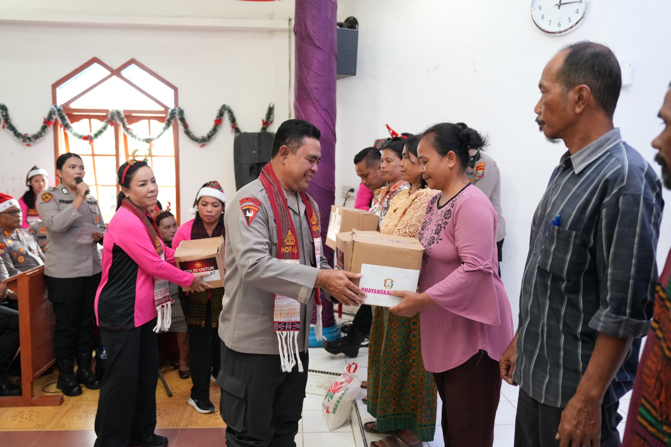 Kapolda Sumatera Utara, Irjen Pol Whisnu Hermawan Februanto, didampingi Ibu Ketua Bhayangkari Daerah Sumatera Utara, Ny. Mona Whisnu Hermawan, secara simbolis menyerahkan bingkisan Natal dan bantuan sosial kepada warga terdampak bencana.