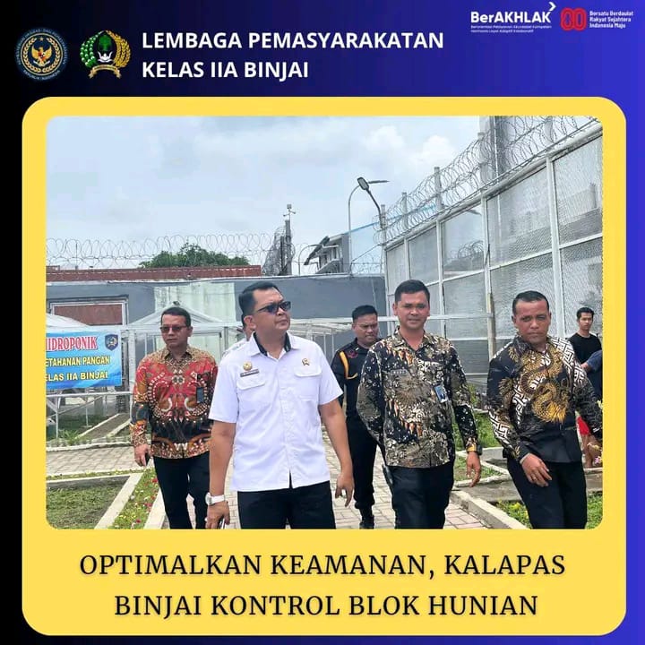 Dalam rangka meningkatkan kedisiplinan dan keamanan di lingkungan Lembaga Pemasyarakatan (Lapas) Kelas IIA Binjai, Kepala Lapas (Kalapas) Binjai, Wawan Irawan didampingi Ka. KPLP, Rudi Sembiring, & Kasi Adm & Kamtib, Serikat Sembiring kembali melakukan kegiatan kontrol blok dan kamar hunian . Kegiatan ini dilaksanakan untuk memastikan keamanan, kenyamanan, serta kedisiplinan seluruh penghuni dan petugas di dalam lapas. Jumat, (10/10/2025).