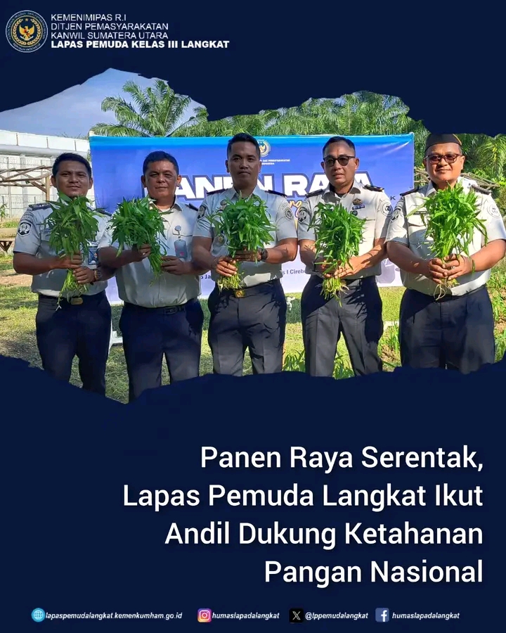 Lembaga Pemasyarakatan (Lapas) Pemuda Kelas III Langkat ikut melaksanakan Panen Raya Serentak Ketahanan Pangan Kementerian Imigrasi dan Pemasyarakatan sebagai wujud dukungan terhadap program ketahanan pangan nasional, Kamis (15/10/2026).