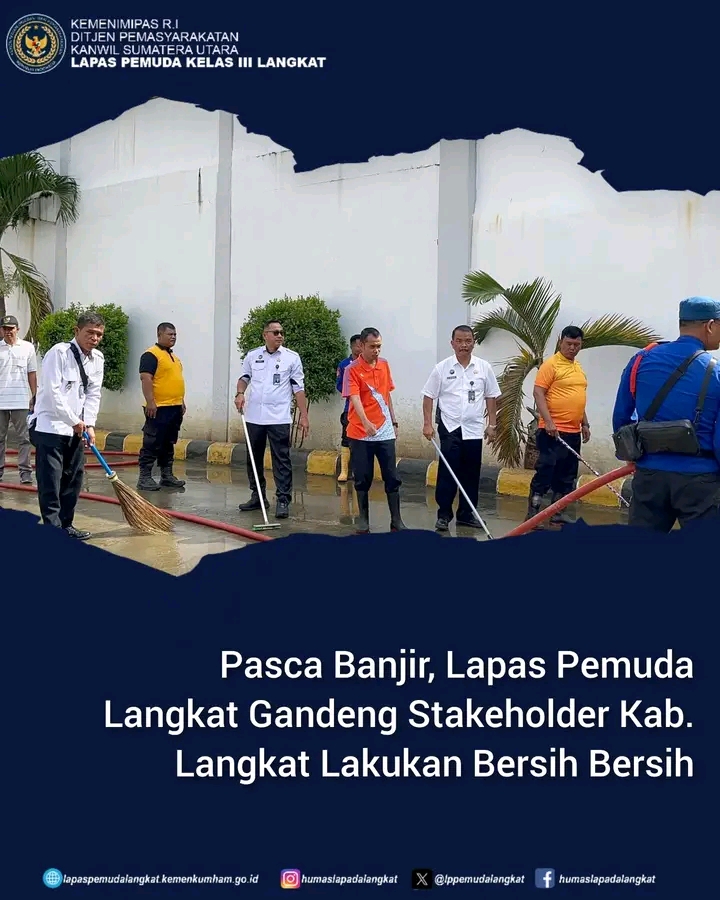 Lembaga Pemasyarakatan (Lapas) Pemuda Kelas III Langkat melakukan pembersihan lingkungan luar kantor Lapas Pemuda Langkat bekerja sama dengan stakeholder Kab.Langkat. Kegiatan ini dilakukan dengan tujuan agar kondisi disekitar kantor bersih dan tidak mengganggu kenyamanan pelayanan di Lapas Pemuda Langkat, Senin (29/12/2025).