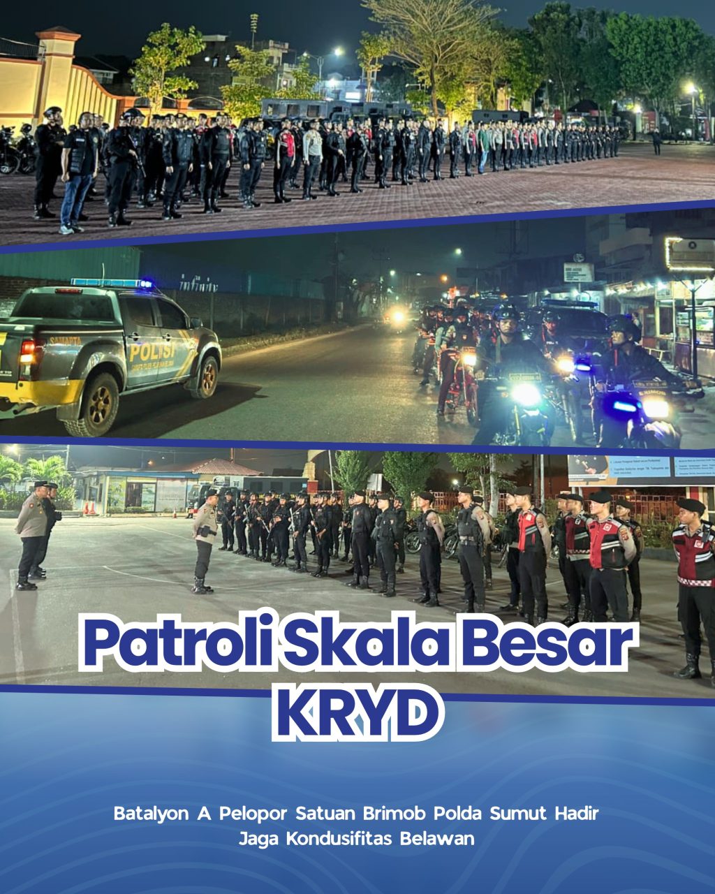 Melalui patroli skala besar ini, Satuan Brimob Polda Sumatera Utara menegaskan kesiapannya untuk terus hadir di tengah masyarakat, menjadi garda terdepan dalam menjaga stabilitas keamanan serta memastikan masyarakat dapat beraktivitas dengan rasa aman dan nyaman.**Erianto Ega
