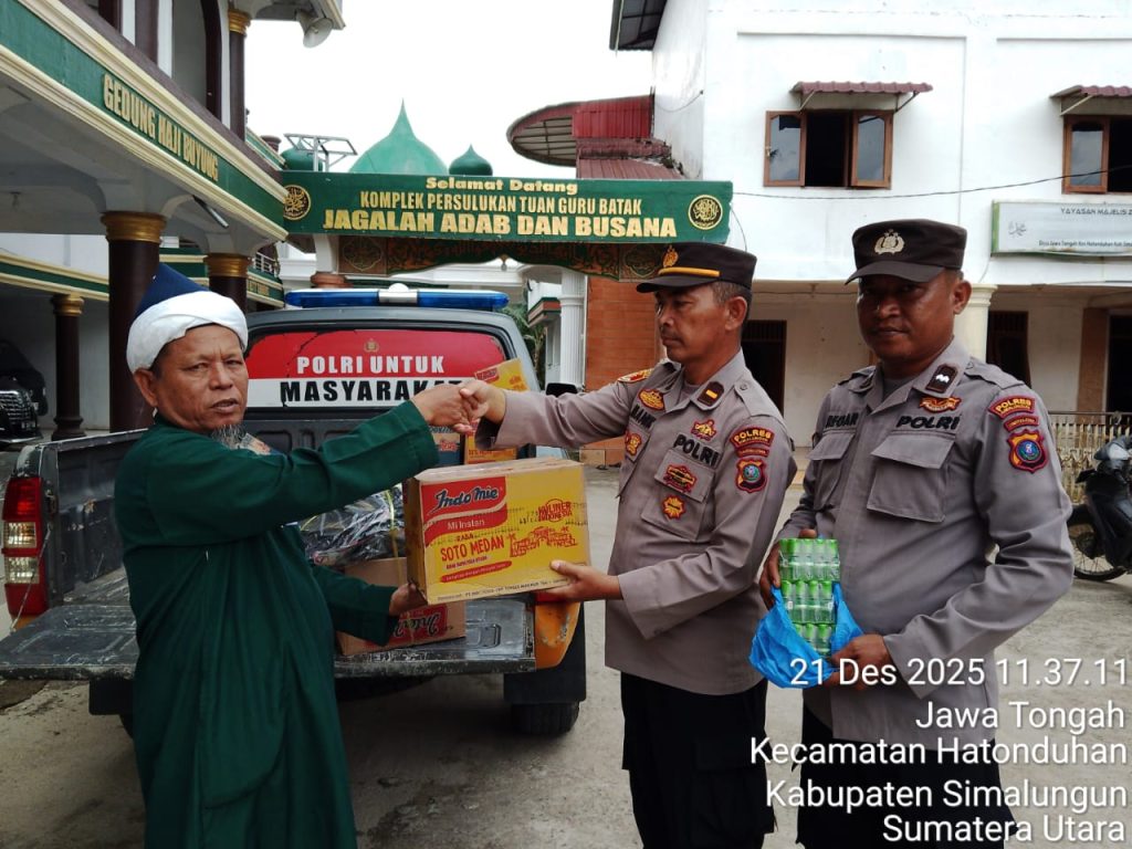 SIMALUNGUN, BLINKISS– Kepedulian Polri terhadap korban bencana alam kembali terwujud nyata. Polsek Tanah Jawa Polres Simalungun menyalurkan bantuan kemanusiaan kepada korban bencana melalui Persulukan Tuan Guru Batak di Jawa Tengah, Kecamatan Tanah Jawa, Kabupaten Simalungun, pada Minggu (21/12/2025) siang.