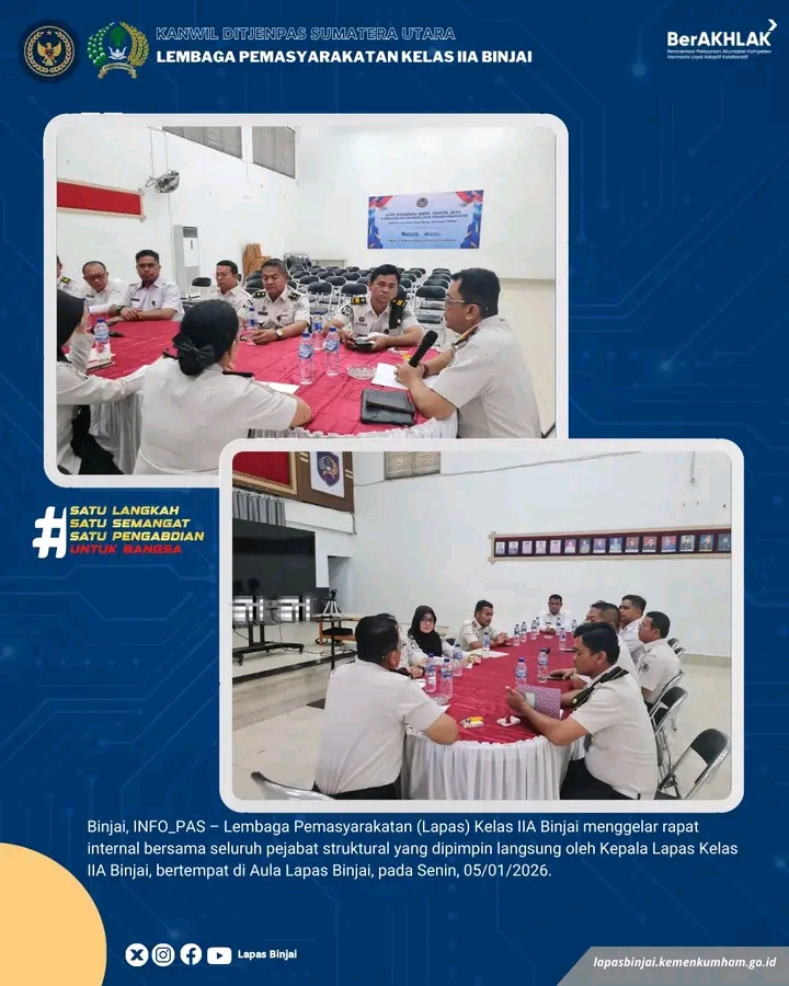 Lembaga Pemasyarakatan (Lapas) Kelas IIA Binjai menggelar rapat internal bersama seluruh pejabat struktural yang dipimpin langsung oleh Kepala Lapas Kelas IIA Binjai, bertempat di Aula Lapas Binjai, pada Senin, 05/01/2026.