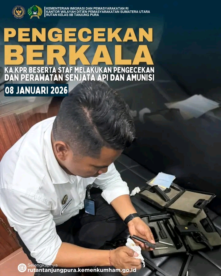 Dalam menjaga keamanan dan ketertiban didalam Rutan Tanjung Pura, salah satunya dengan memastikan kondisi senjata api dan amunisi yang dilaksanakan oleh Ka. Kesatuan Pengamanan Rutan, Efriyanto dan staf. Kamis (08/01)