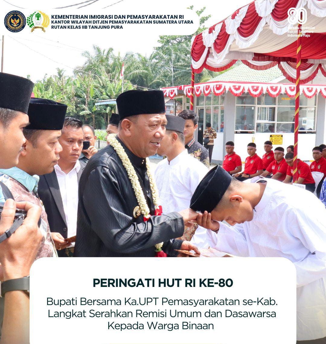 Dalam rangka peringatan Hari Ulang Tahun (HUT) ke-80 Kemerdekaan Republik Indonesia, ribuan warga binaan Unit Pelaksana Teknis (UPT) se-Kabupaten Langkat menerima pengurangan masa hukuman atau remisi. Remisi yang diterima warga binaan terdiri dua macam remisi yakni remisi umum (RU) dan Remisi Dasawarsa (RD). Minggu (17/8)