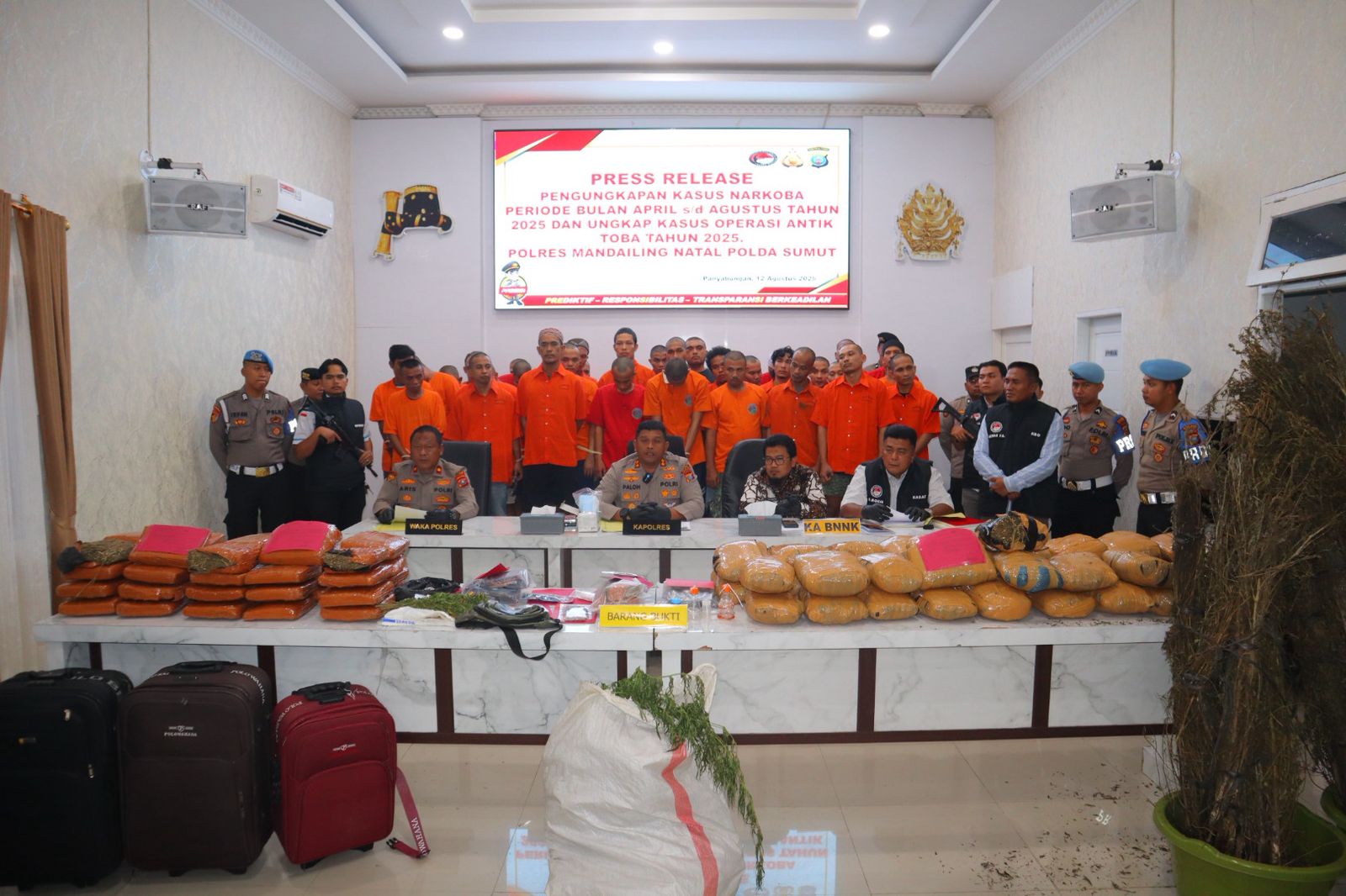 “Dari 36 tersangka ini, kita berhasil menyita barang bukti sabu 86,47 gram. 65,50 kilogram daun ganja kering siap edar. Pil ekstasi 5 butir. 6 hektare ladang ganja di bukit Tor Sihite, dan 6 batang tanaman ganja di pegunungan Hutabargot,” kata Kapolres Madina.