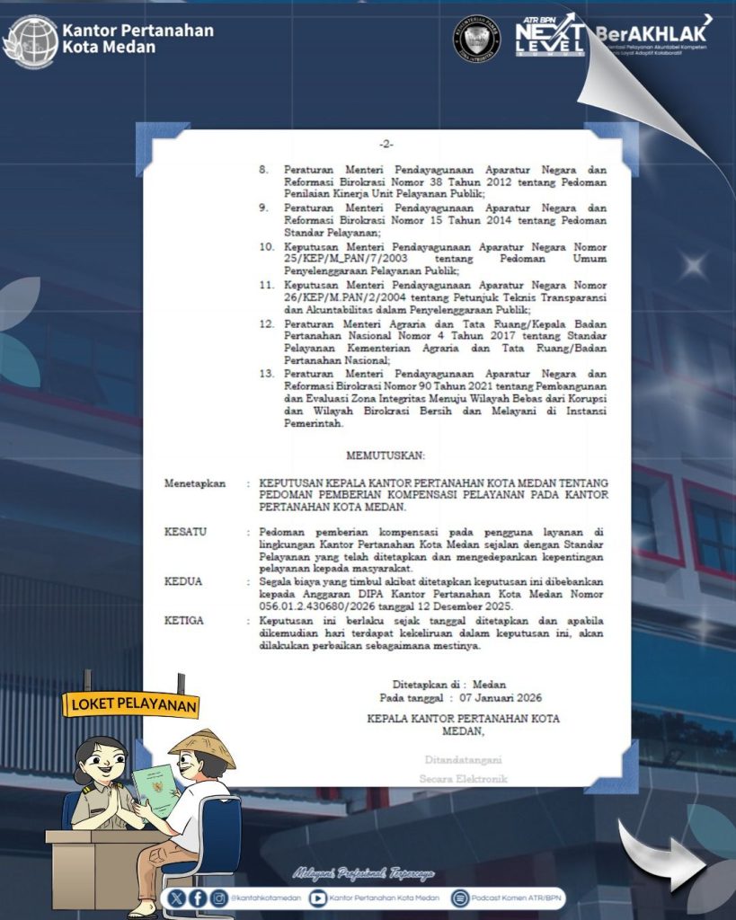 Keputusan tersebut ditetapkan oleh Kepala Kantor Pertanahan Kota Medan dan berlaku bagi seluruh penyelenggaraan pelayanan administratif di lingkungan Kantor Pertanahan Kota Medan. Pedoman ini menjadi acuan bagi petugas dalam memberikan kompensasi kepada penerima layanan apabila terjadi keterlambatan pelayanan yang tidak sesuai dengan standar waktu pelayanan yang telah ditentukan.