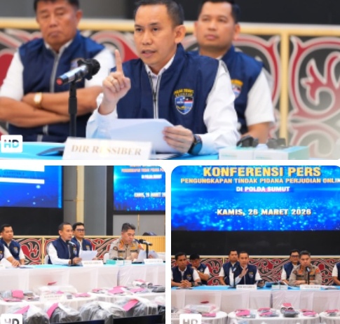 Pengungkapan kasus itu disampaikan dalam konferensi pers di Aula Tribrata Polda Sumut, Kamis (26/3/2026). Kegiatan dibuka oleh Kabid Humas Polda Sumut Kombes Pol Ferry Walintukan, S.I.K., S.H., M.H., sementara paparan perkara disampaikan langsung oleh Dirresiber Polda Sumut Kombes Pol Dr. Bayu Wicaksono, S.H., S.I.K., M.Si.