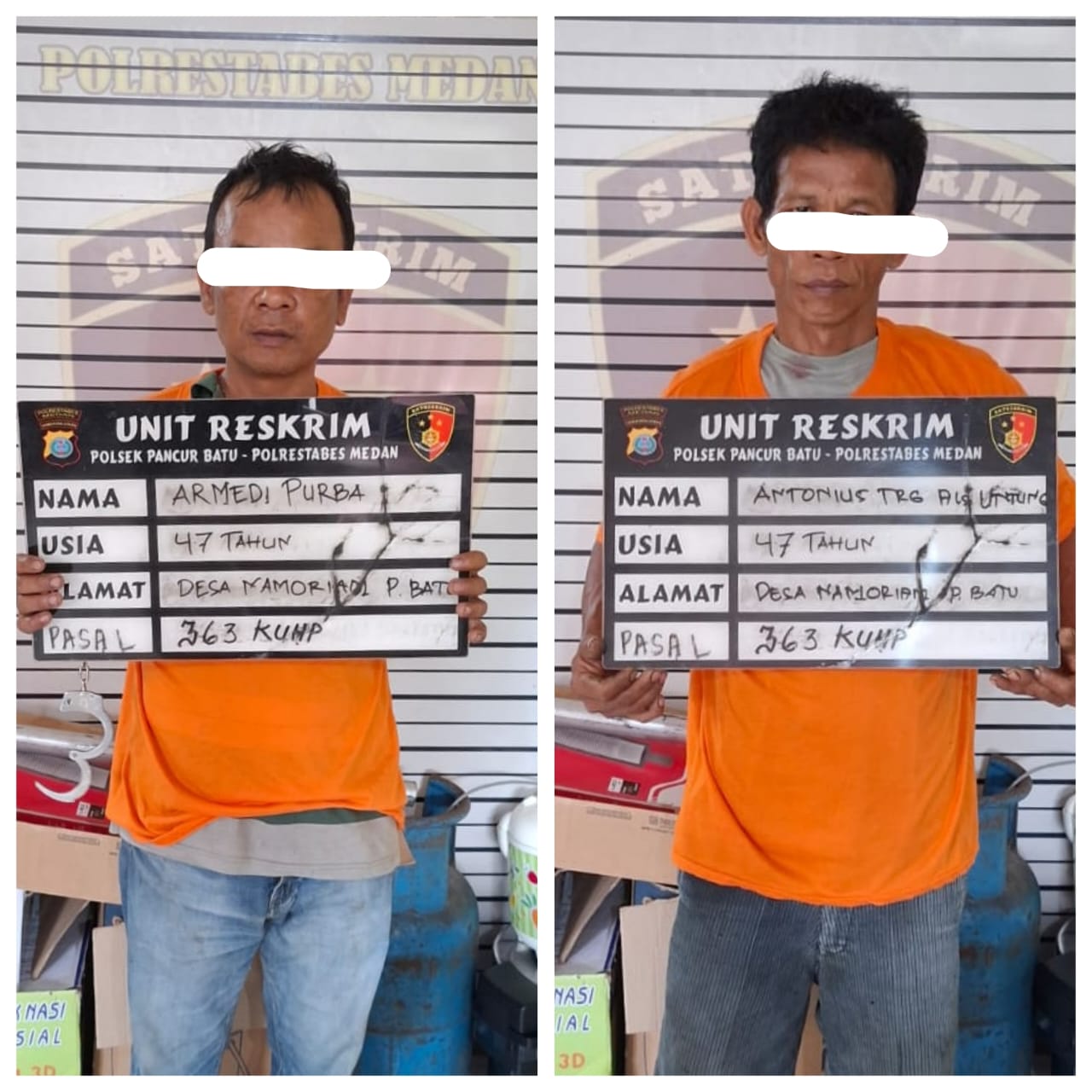 Pancur Batu, BLINKISS – Tim Reskrim Polsek Pancur Batu berhasil meringkus dua pelaku pencurian yang telah meresahkan warga. Kedua tersangka adalah AR Purba (46), warga Dusun II, Desa Namo Riam, Kecamatan Pancur Batu, dan AT alias Untung (47), warga Dusun IV, Desa Namo Riam, Kecamatan Pancur Batu.