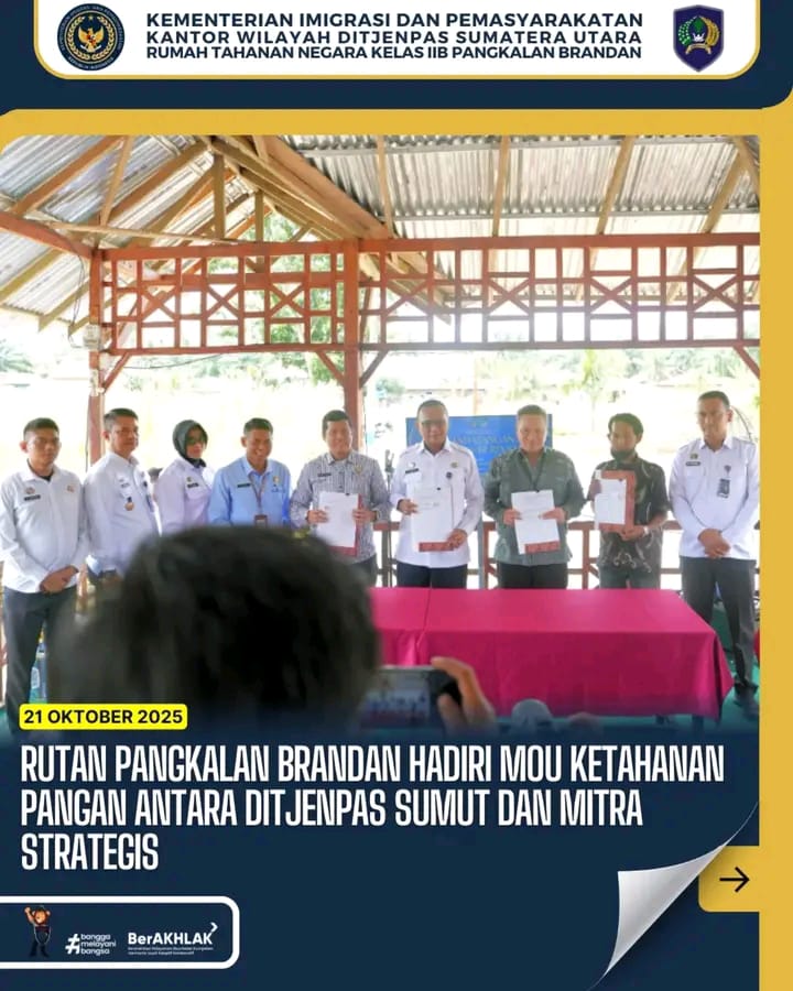 Rumah Tahanan Negara Kelas IIB Pangkalan Brandan turut berpartisipasi dalam kegiatan penandatanganan Perjanjian Kerja Sama atau MoU antara Kantor Wilayah Direktorat Jenderal Pemasyarakatan Sumatera Utara dengan Dinas Ketahanan Pangan, Tanaman Pangan dan Hortikultura Provinsi Sumatera Utara, Dinas Perkebunan dan Peternakan Provinsi Sumatera Utara, Koperasi Merah Putih Desa Pantai Cermin Kabupaten Langkat, serta Bank BRI Regional Medan pada Selasa, 21 Oktober 2025.