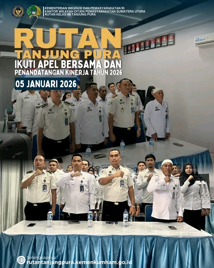 Kegiatan ini diikuti oleh Karutan Tanjung Pura, Fransisco Pandia bersama pejabat struktural dan jajaran di Aula Rutan Tanjung Pura secara khidmat dan penuh semangat menyongsong tahun kerja 2026. Apel ini menjadi momen penting dalam penguatan komitmen serta semangat pegawai dalam melaksanakan tugas di tahun ini. Mengusung tema “ 2026 Kemenimipas Kerja Nyata, Pelayanan PRIMA” menjadi cerminan bersama dalam memberikan pelayanan publik yang semakin optimal.