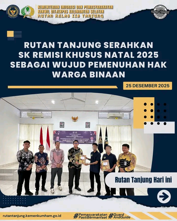 Berdasarkan surat keputusan yang dikeluarkan oleh menteri imigrasi dan Pemasyarakatan nomor: Pas 2 2 4 1 PK 05 03 Tahun 2025 tentang Pemberian Remisi khusus RK Natal tahun 2025 kepada narapidana dan pengurangan masa Pidana khusus PMPK Natal tahun 2025 kepada anak binaan rumah tahanan negara Rutan kelas llB Tanjung secara Simbolis menyerahkan Remisi khusus Hari Natal kepada dua orang Narapidana beragama Nasrani dalam rangka Perayaan Hari Natal tahun 2025 di rutan kelas llB Tanjung Kamis Tanggal 25-12-2025