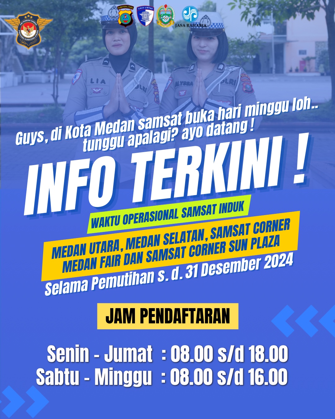 Adapun Samsat yang beroperasi meliputi Samsat Induk Medan Utara, Medan Selatan, Samsat Corner Medan Fair, dan Samsat Corner Sun Plaza. Dengan waktu operasional yang diperpanjang, masyarakat kini memiliki lebih banyak kesempatan untuk mengurus pajak kendaraan.