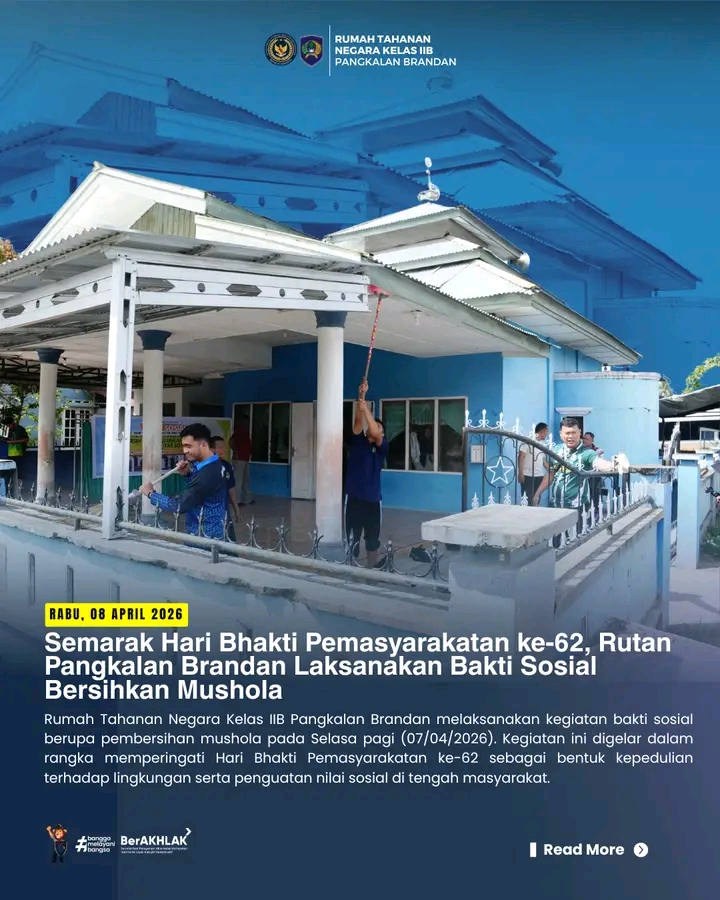 Rumah Tahanan Negara Kelas IIB Pangkalan Brandan melaksanakan kegiatan bakti sosial berupa pembersihan mushola pada Selasa pagi (07/04/2026). Kegiatan ini digelar dalam rangka memperingati Hari Bhakti Pemasyarakatan ke-62 sebagai bentuk kepedulian terhadap lingkungan serta penguatan nilai sosial di tengah masyarakat.