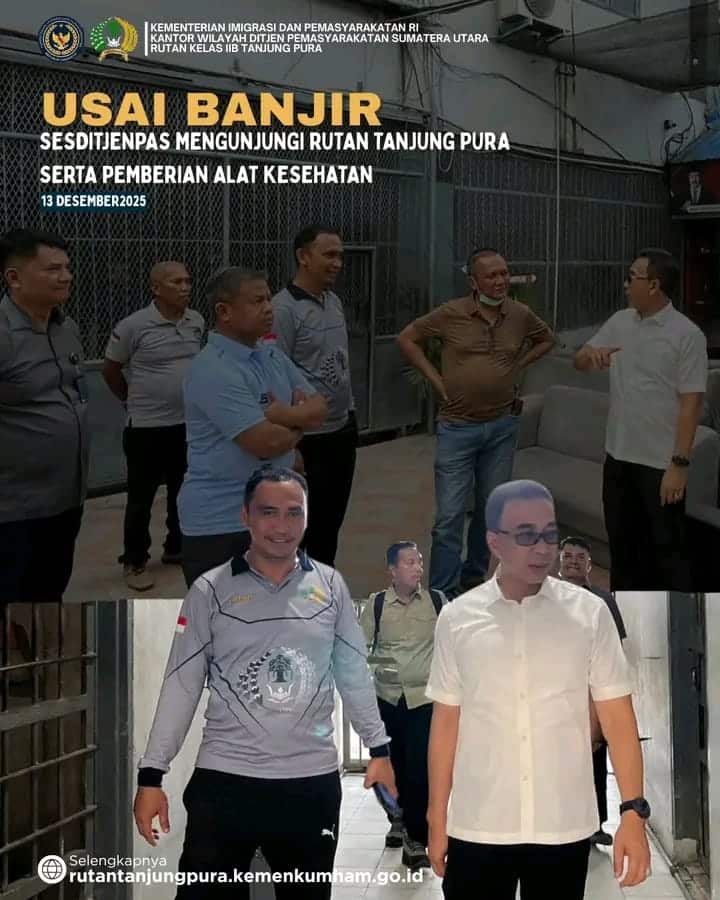 Sekretaris Direktorat Jenderal Pemasyarakatan (Ses Ditjenpas) melaksanakan kunjungan kerja ke Rumah Tahanan Negara Kelas II B Tanjung Pura guna meninjau kondisi pasca banjir. Kunjungan ini bertujuan memastikan kesiapan sarana, kebersihan lingkungan, serta pelayanan kesehatan bagi warga binaan dan petugas.