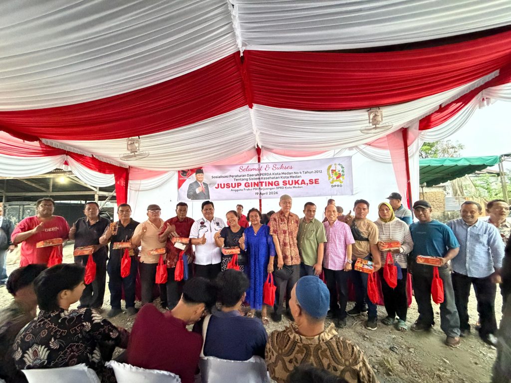 Medan, BLINKISS — Anggota DPRD Kota Medan dari Fraksi PDI Perjuangan, Jusup Ginting Suka, SE menggelar kegiatan sosialisasi Peraturan Daerah (Perda) Kota Medan Nomor 4 Tahun 2012 tentang Sistem Kesehatan Kota Medan di Jalan Masjid No. 12, Kelurahan Cinta Damai, Kecamatan Medan Helvetia, Minggu (19/4/2026) sore.